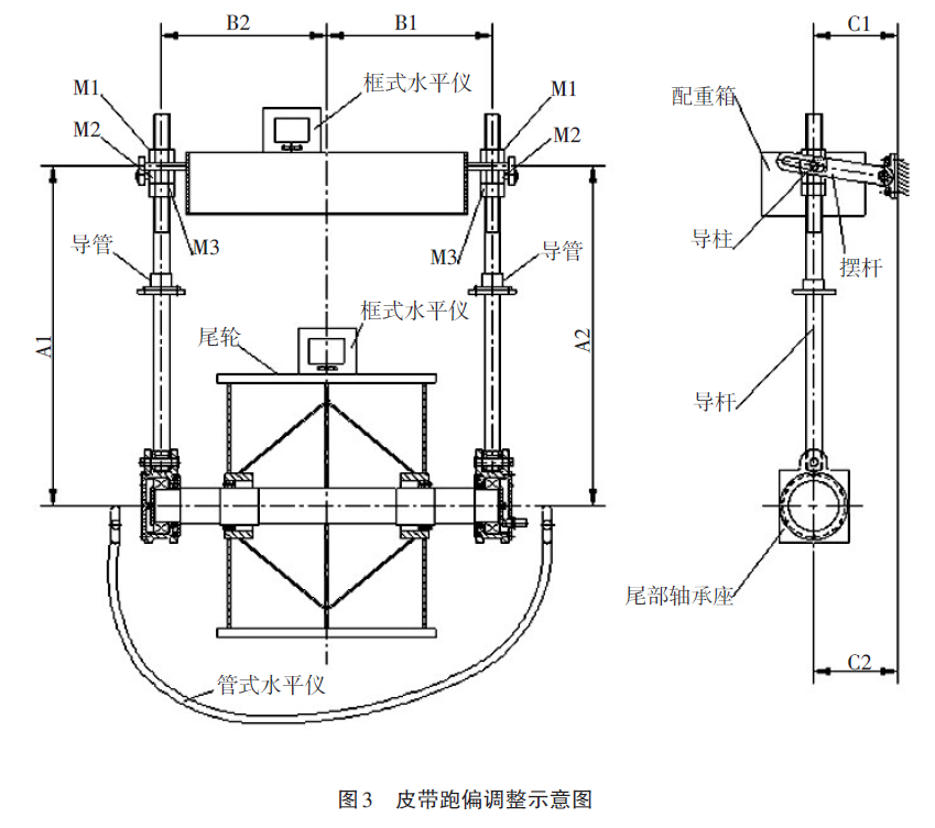 (3)钢丝胶带斗式提升机试运行时胶带跑偏的调整。松开两边M1螺母,观察胶带跑偏方向,向左跑偏紧左M2螺母,向右跑偏则紧右M2螺母(理论值│A1-A2│≤0.5、│B1-B2│≤0.5、│C1-C2│≤0.5),达到理想要求后,紧固两边M1、M2、M3螺母。调整完成后,尾轮组件应能在摆杆范围内上下活动自如,尾轮转动灵活,无卡阻、刮磨现象。摆杆滑槽与导柱滑动可靠,导管导柱全程可靠。在调试过程中,经常碰到纠偏无效的情况,要冷静分析、仔细查找原因。首先重点检查尾部轴承座两侧滑槽与箱体滑轨之间的间隙是否满足要求,如有卡阻,应松开滑轨固定螺栓进行调整,满足要求后紧固螺栓,保证尾部轴承座上下滑动自如,无卡阻现象;其次检查摆杆内侧与导柱端面的间隙,不能贴紧,要保持0.5mm的间隙;再次检查配重箱是否在现场加满碎铁块后再注入混凝土,如未加满碎铁块,配重箱重量不够,将无法张紧胶带,造成纠偏无效。