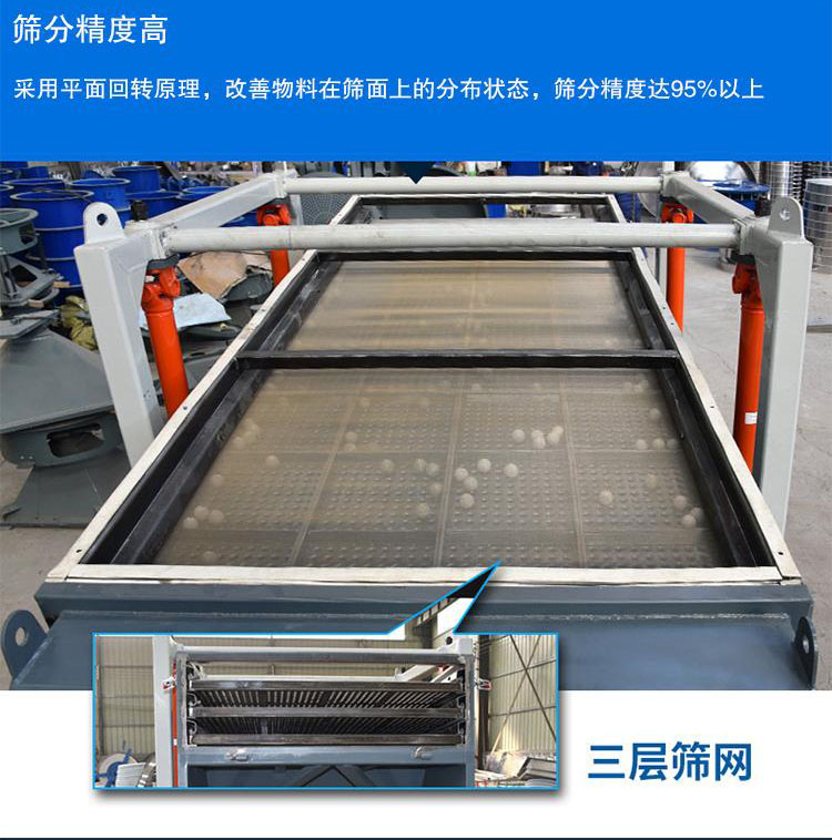 换网更加便捷,操作简单,牢固可靠;大型静电喷塑工艺,设备更加美观、耐磨、防锈。对于生产石油支撑剂压裂砂的生产厂家对于砂子的精度和筛分产量有着非常高的要求。而生产的超精细方形摇摆筛对于筛分石油支撑剂压裂砂有着非常好的使用现况和应用前景。目前很多企业对于方形摇摆筛的使用和认知都在一步步替代普通的振动筛分机。石油支撑剂压裂砂使用方形摇摆筛符合环保要求:方形摇摆筛具有良好的封闭性能,作业过程无分粉尘的逸散,为环境与人员安全提供保障。