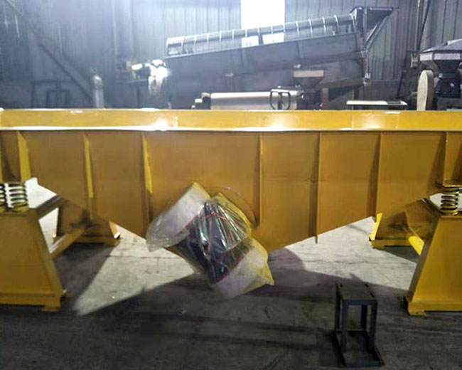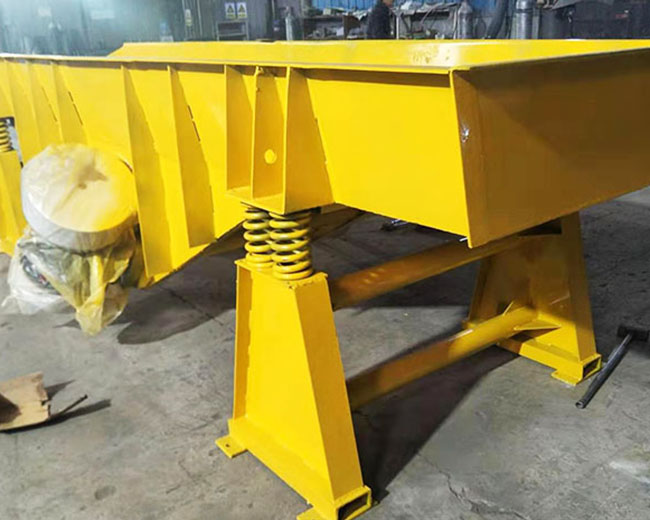 电机振动水平输送机采用两台振动电机作为激振动源,运用自同步原理,两台振动电机反向转动,使输送机底部平衡架产生往复振动,经过主振簧与导向板簧的作用,带动上部输送槽振动,从而达到输送物料的目的。